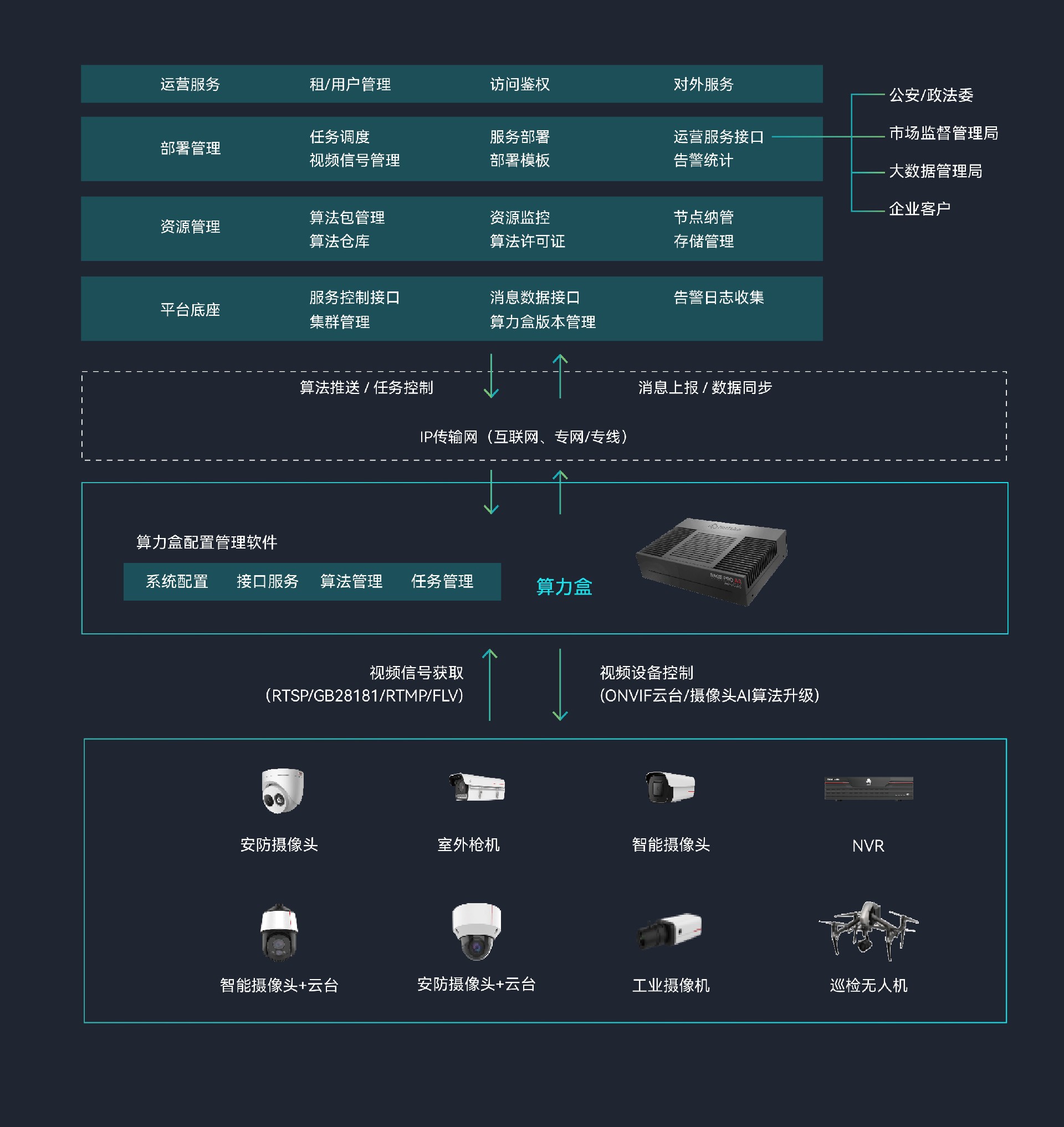 推出的Sage Basic A1边缘计算微服务器,专为智能视频应用而设计。该服务器支持多路视频编解码,高效适配市 场上所有AI算法,能够轻松应对各类智能视频分析任务。其应用领域广泛,涵盖智慧城市、智慧园区、智慧乡村、智慧校园 以及智慧安防等多个AI应用场景。此外,视频AI边缘算力盒产品包含云边协同管理系统、边缘算力盒配置管理软件以及算力 盒终端三部分,能够实现边缘侧的AI处理和快速响应,同时借助云边协同技术,可随时随地灵活部署检测任务和算法,为用 户带来前所未有的便捷和高效体验。